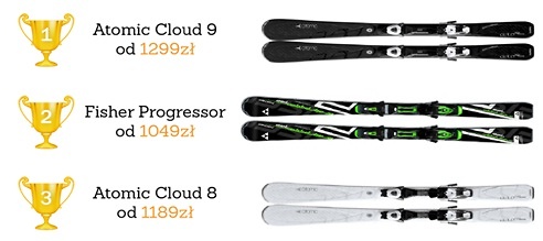 Rolę, jaką podczas wyboru nart odgrywa ich producent podkreśla również ranking bestsellerowych modeli. Na pierwszym i trzecim miejscu podium znalazły się produkty Claoud 9 i Cloud 8 firmy Atomic. Zdobywcą srebrnego medalu zostały narty Progressor, wyprodukowane przez obecną na rynku od 80 lat, austriacką firmę Fisher. Wszyscy trzej liderzy rankingu są modelami wyposażonymi w wiązania, a ich cena waha się od 1049 do 1299 zł. Pokusić się więc można o stwierdzenie, że jeżdżący na nartach Internauci wolą jednorazowo wydać większą kwotę, niż kompletować zestaw narty plus wiązania na własną rękę.
